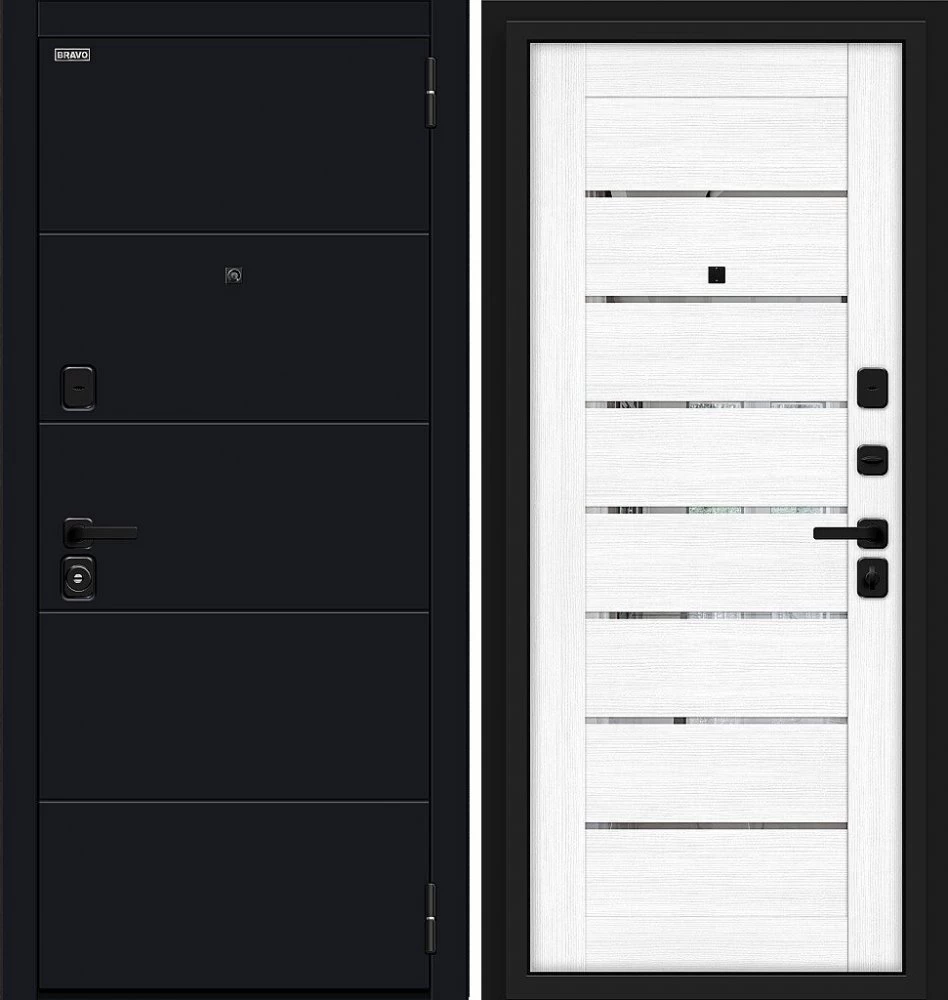 Надежная входная Дверь Браво Прайд Total Black/Snow Melinga премиум класса по цене 39 357 руб. Большая толщина стали защитит от проникновения в ваш дом, квартиру или коттедж. Используется очень качественная фурнитура: замки, цилиндры, ручки, защелки. Покрытие и отделка двери изготовлено под внимательным контролем производителя. Дверь имеет долгий срок службы и гарантию.